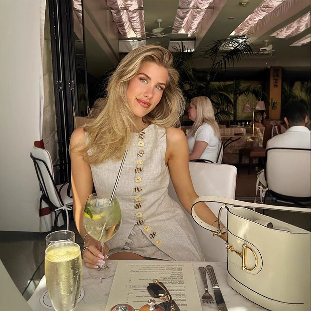 Affichez un look élégant et structuré avec cet ensemble deux pièces composé d’un gilet sans manches boutonné et d’une jupe courte. Son motif géométrique apporte une touche contemporaine, idéale pour les journées estivales et les sorties entre amis.