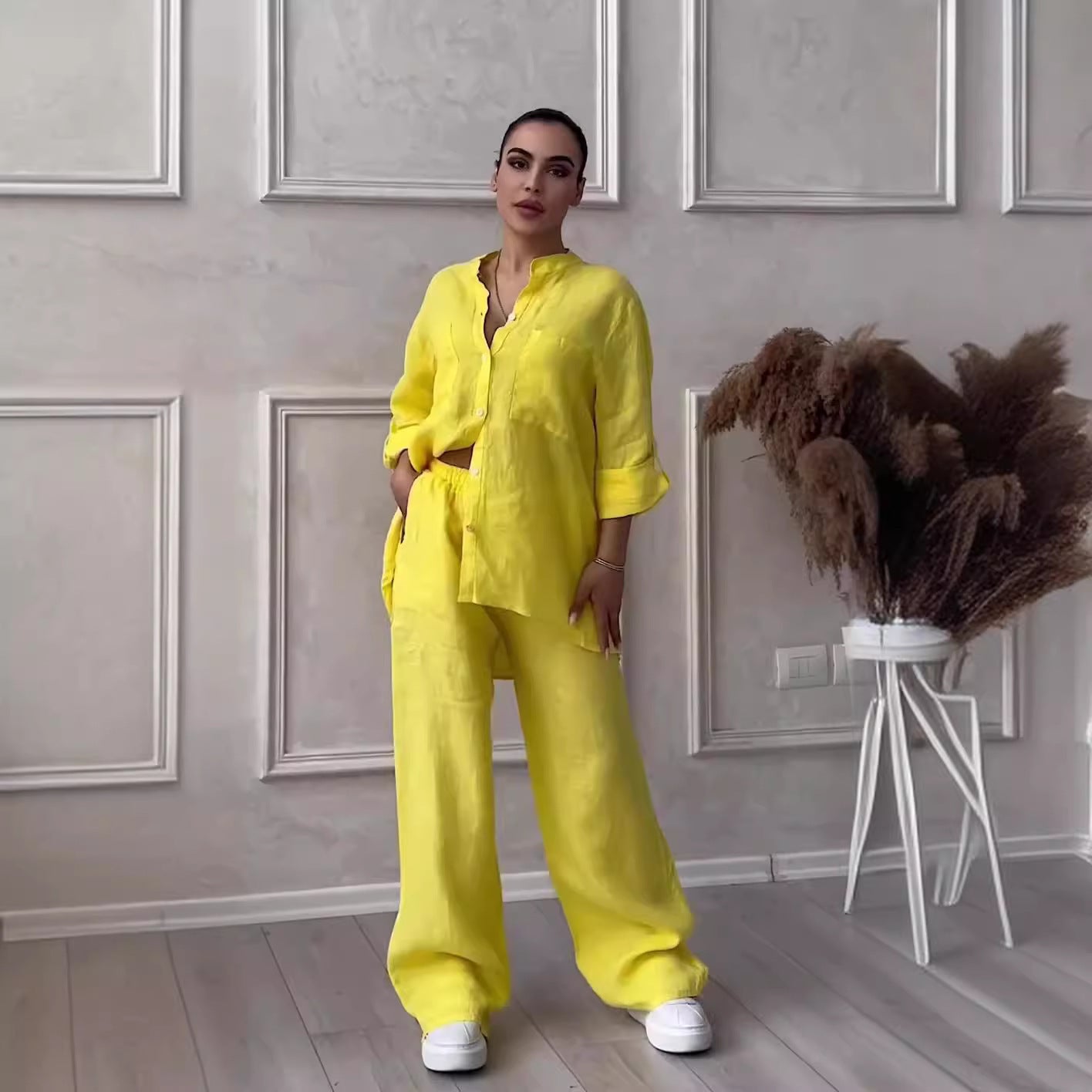 Disponible en jaune, gris granny et bleu roi, cet ensemble s’adapte à toutes vos envies. Il se combine facilement avec des baskets pour un style urbain ou avec des sandales pour une allure plus élégante.